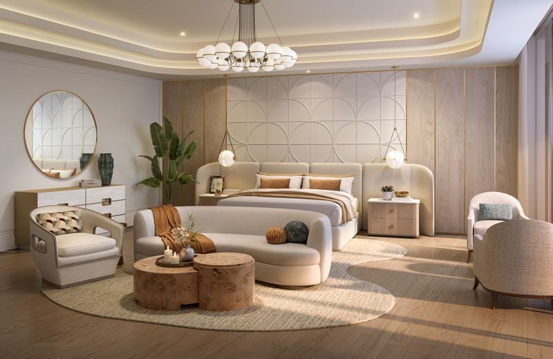 The owner’s suite is one of the most impressive features in the residence. It is designed as a true retreat, complete with separate his-and-her baths and wardrobes, a flex room, a sauna, and a morning bar. That creates an experience that feels more like a private spa suite than a traditional primary bedroom.